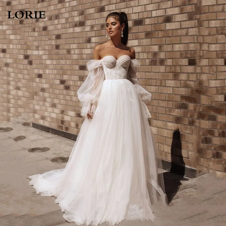 LORIE Принцесса Свадебные платья Милая с буфами на рукавах подвижный пляжное свадебное платье с открытыми плечами кружевное платье с от�…