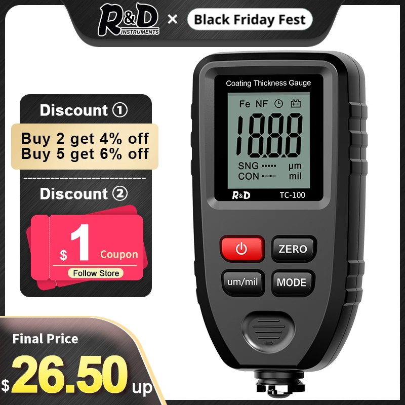 R&D TC100 толщиномер покрытия 0,1 микрон/0-1300 автомобильная краска пленка тестер толщины измеритель измерения FE/NFE русский ручной инструмен�…