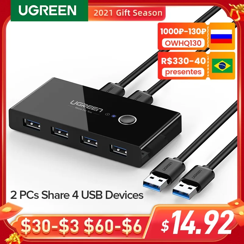 KVM-переключатель Ugreen USB 3,0 2,0, KVM-переключатель для Windows 10, ПК, клавиатуры, мыши, принтера, 2 шт., совместное использование 4 устройств, USB-пер�…